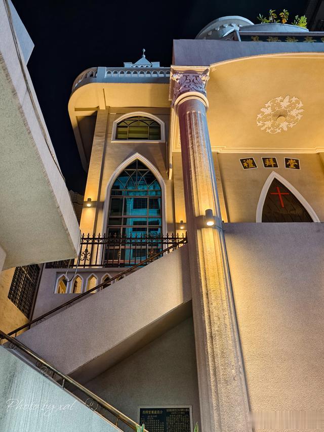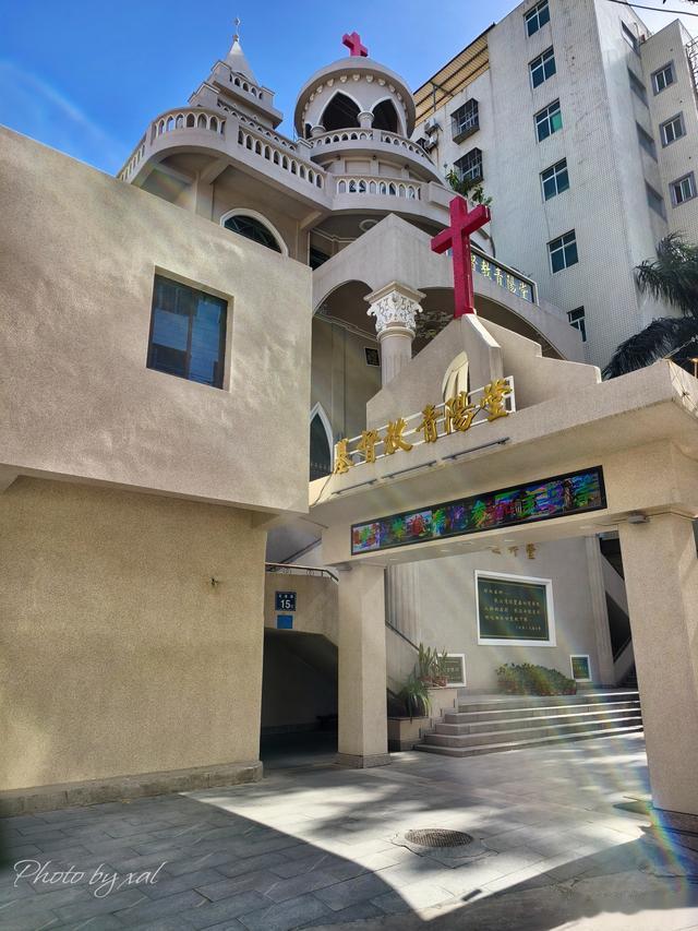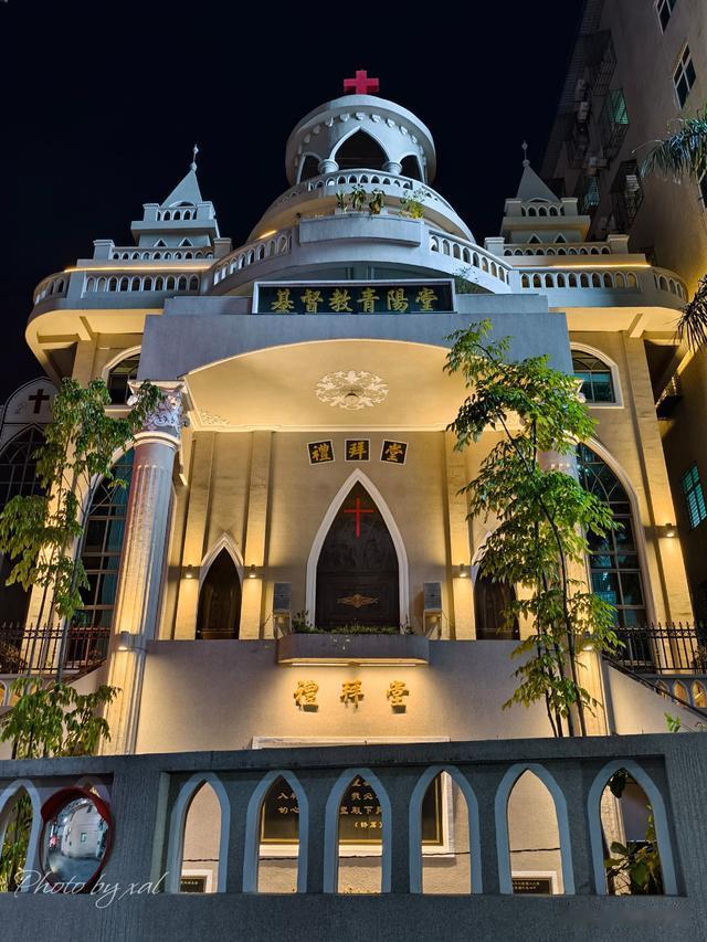 石泉路东头紧挨着酒店的,是基督教青阳堂。这是一幢外观庄严、宏伟的教堂建筑。从泉安中路走进去,一眼就能看见神圣的红色十字架。