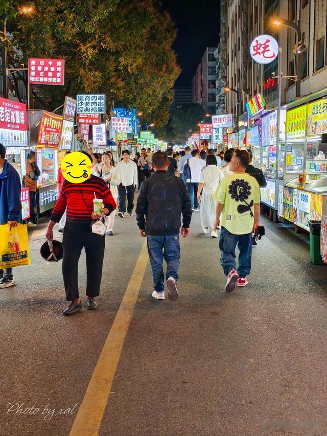 刚迈进夜市之时,感觉和其它地方的也差不太多。继续往前走,等走到两条街的十字交叉口,再环视四周——哦买噶!那阵势,实实在在地惊到了我们!便以脚下站位为中心,两条街,东南西北四个方向,美食摊满满当当地向外延伸,攒动的人头更是遮挡了尽头所在!