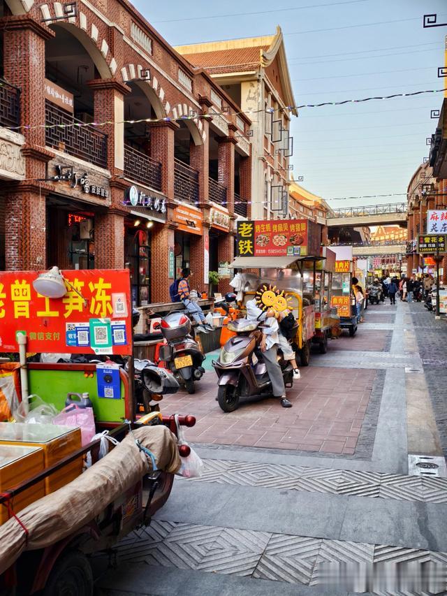 两边骑廊下,是各种生活小店铺。简简单单的装修,随随意意地陈列,主打一个“接地气”。至于商业街中间,则是一列夜市小摊。尽管天色尚早,不少商家已经开始营业了。