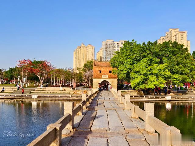 安平桥是公园的核心景观,处在园区的中间位置。入口有一座两层砖石小塔楼,闽南传统风格。门楼上有名——望高楼。下面的题字“金汤永固”,指的就是始建于南宋绍兴八年的安平桥了。历经八百八十多年的时光流转,足以担当这个词的全部分量。