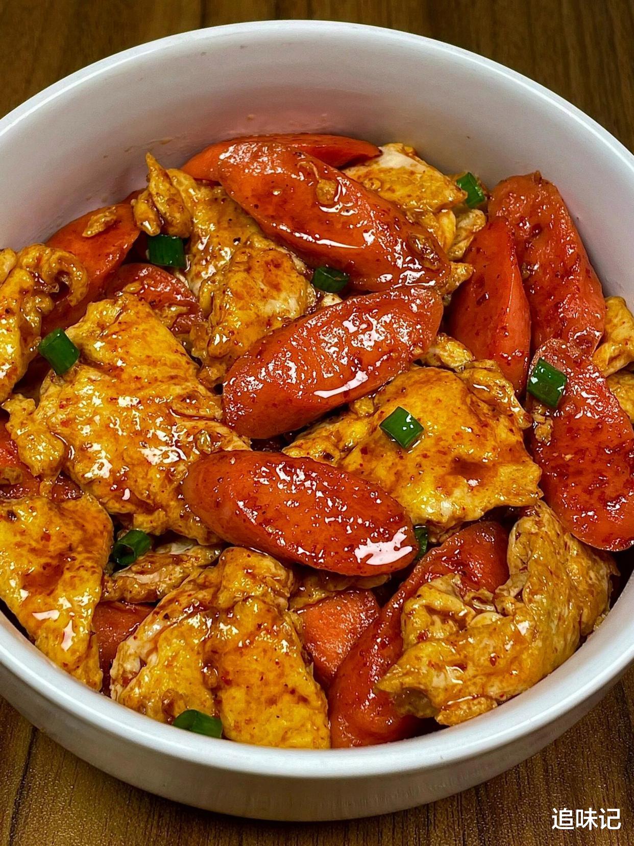 鸡蛋炒火腿肠简单快捷的家常小炒,将炒蛋和煎过的火腿肠混合自制酱汁翻炒,味道丰富,微辣带甜,适合快速餐食。