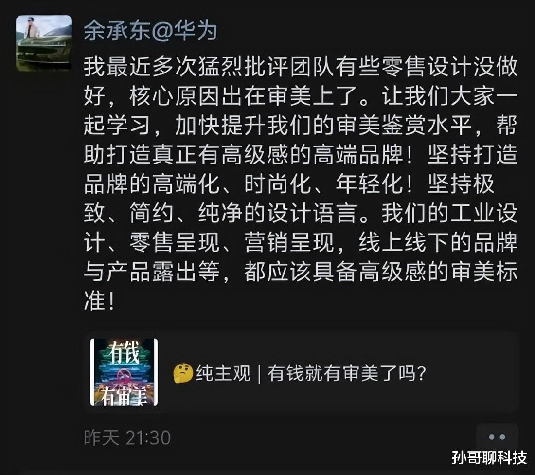 前两天,华为终端业务负责人余承东猛批设计团队,吐槽,核心原因在审美方面出现问题,需要一起学习提升审美水平。余承东还强调,品牌要坚持高端化和时尚化,为年轻人打造简约纯粹极致的设计语言,无论线上还是线下品牌产品,都应该具备高级审美标准。