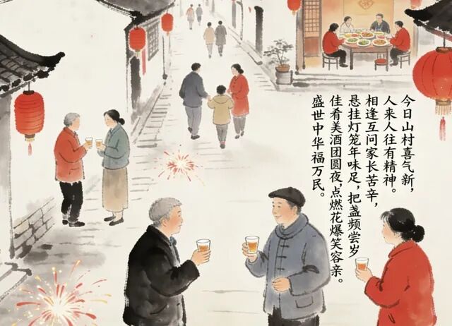 今日山村喜气新,人来人往有精神。