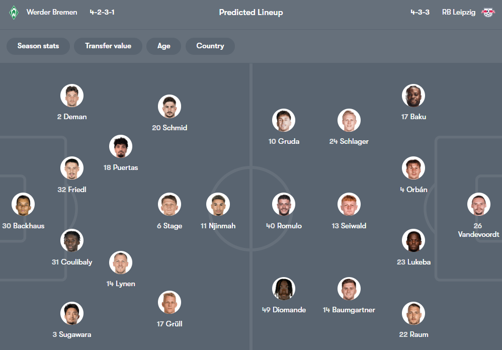 莱比锡惯用433阵型,依赖高压逼抢与快速攻防转换,依靠迪奥曼德的速度、鲍姆加特纳的穿插制造进攻威胁,但在主力门将与中场核心缺阵、体能不足的情况下,球队的高位逼抢强度会有所下降,身后空间更容易被不莱梅利用,而不莱梅的收缩防守与主场对抗强度,恰好能克制莱比锡的快速进攻体系。