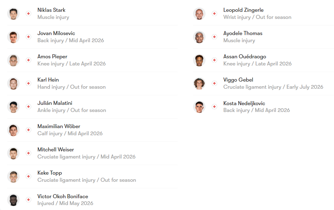 而莱比锡则面临更严重的阵容损耗,主力门将古拉西长期伤缺,本场依旧无法出战,首发门将由范德沃罗特担任,防线稳定性有所下降;中场创造力核心格鲁达因内收肌伤病缺席,球队中场的推进与最后一传能力受到明显削弱,虽边锋迪奥曼德肩伤恢复可以出战,但整体中后场的实力折损较为明显。
