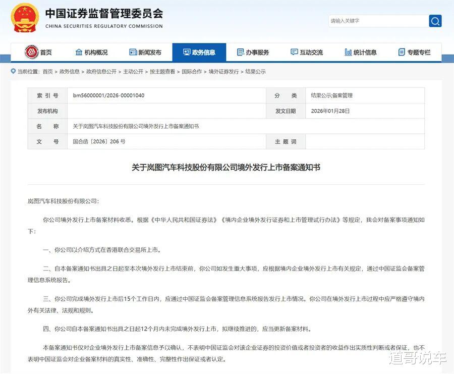 值得关注的是,详细产品规划,行业一般会“守口如瓶”,而此次岚图一反常态,究竟为了什么?或许是时间上的巧合,同日,中国证监会下发岚图汽车科技股份有限公司境外发行上市备案通知书,岚图汽车拟以介绍方式在香港联合交易所上市。这也意味着,岚图拿到了港股上市的“通行证”。