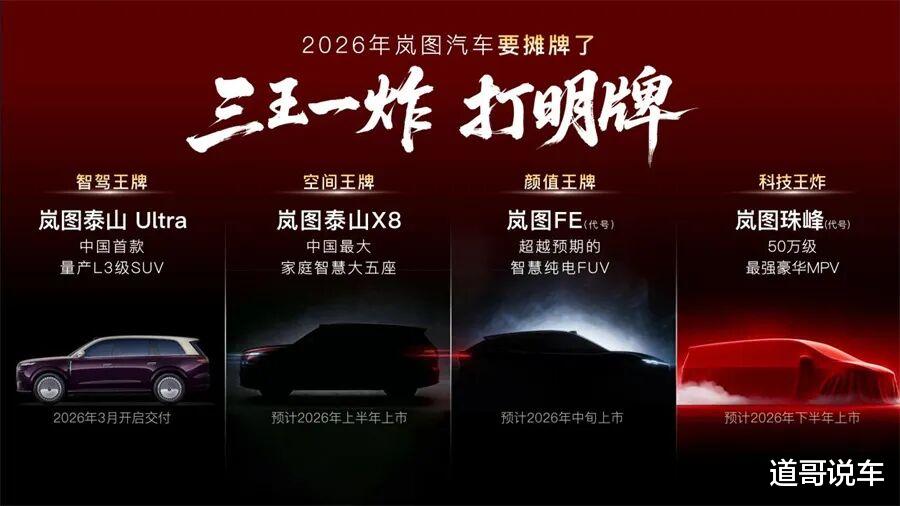岚图泰山Ultra、岚图泰山X8、岚图FE(代号)及岚图珠峰(代号)是岚图汽车于1月28日透露的2026年产品规划。尽管在邵明峰的介绍中,各个车型有各个车型的优势,比如泰山X8的大,FE的帅,珠峰的豪,但在笔者看来,“L3”才是贯穿岚图2026年产品规划的核心词汇。