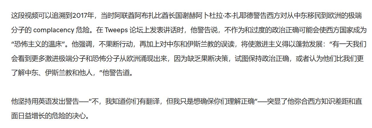 他在2017年的时候就表达过明确的意思。说总有一天,我们会看到,更多的极端分子和恐怖分子来自欧洲。因为(西方)缺乏决断力,试图保持政治正确,或者自以为了解中东和伊斯兰教