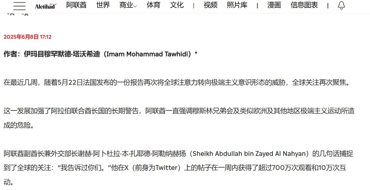 比如阿联酋副总统兼外交部长谢赫·阿卜杜拉·本·扎耶德·阿勒纳赫扬去年5月说,阿联酋一直强调穆斯林兄弟会及类似欧洲及其他地区极端主义运动所造成的危险。