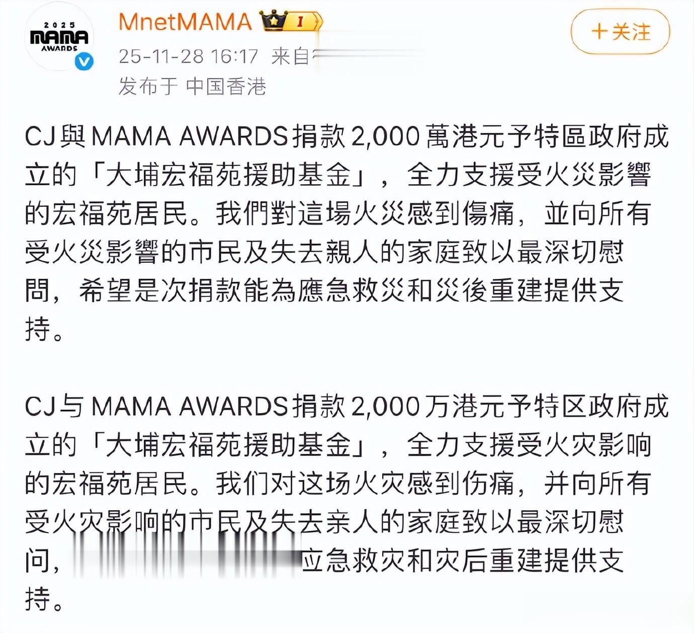 11月29号,本应该星光闪耀、粉丝狂欢的MAMA颁奖礼因为大埔宏福苑火灾蒙上了一层阴影。