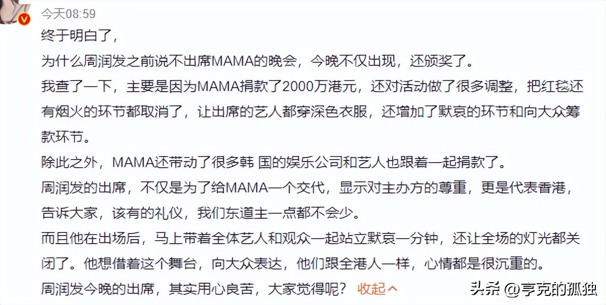 11月26日香港突发大火,让一年一度的MAMA盛典不得不调整了活动安排,取消了红毯和烟火表演,还加了为遇难者默哀的环节,就是想在哀悼与庆典之间找个平衡点。