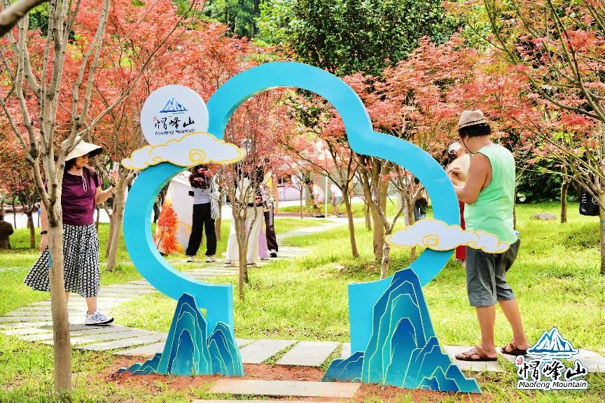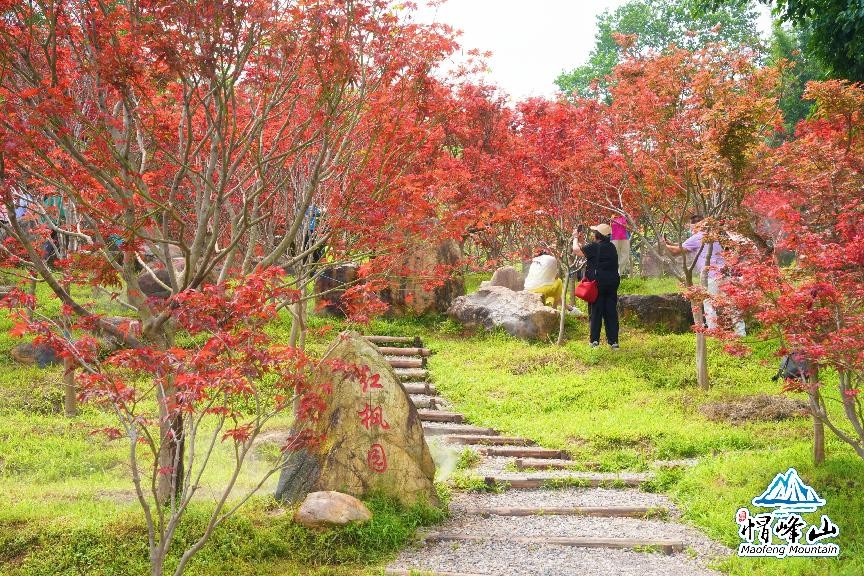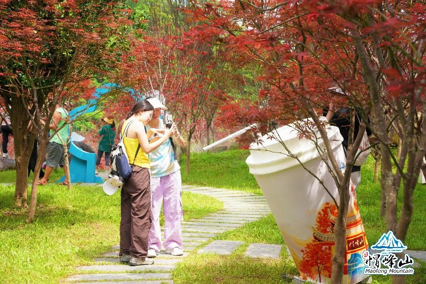 眼下的帽峰山,正是秋色最浓时:近万平方米红枫园内,2500 余株鸡爪槭叶片如霞似火,深红、橙红交织成绚烂画卷,正值最佳观赏期,堪称“湾区最早秋色绝佳打卡地” 。园内精心打造的特色打卡点与艺术布景,藏于枫树丛中、依着山势铺展,与自然景观无缝相融,引得大批游客、摄影爱好者慕名而来,快门声此起彼伏。