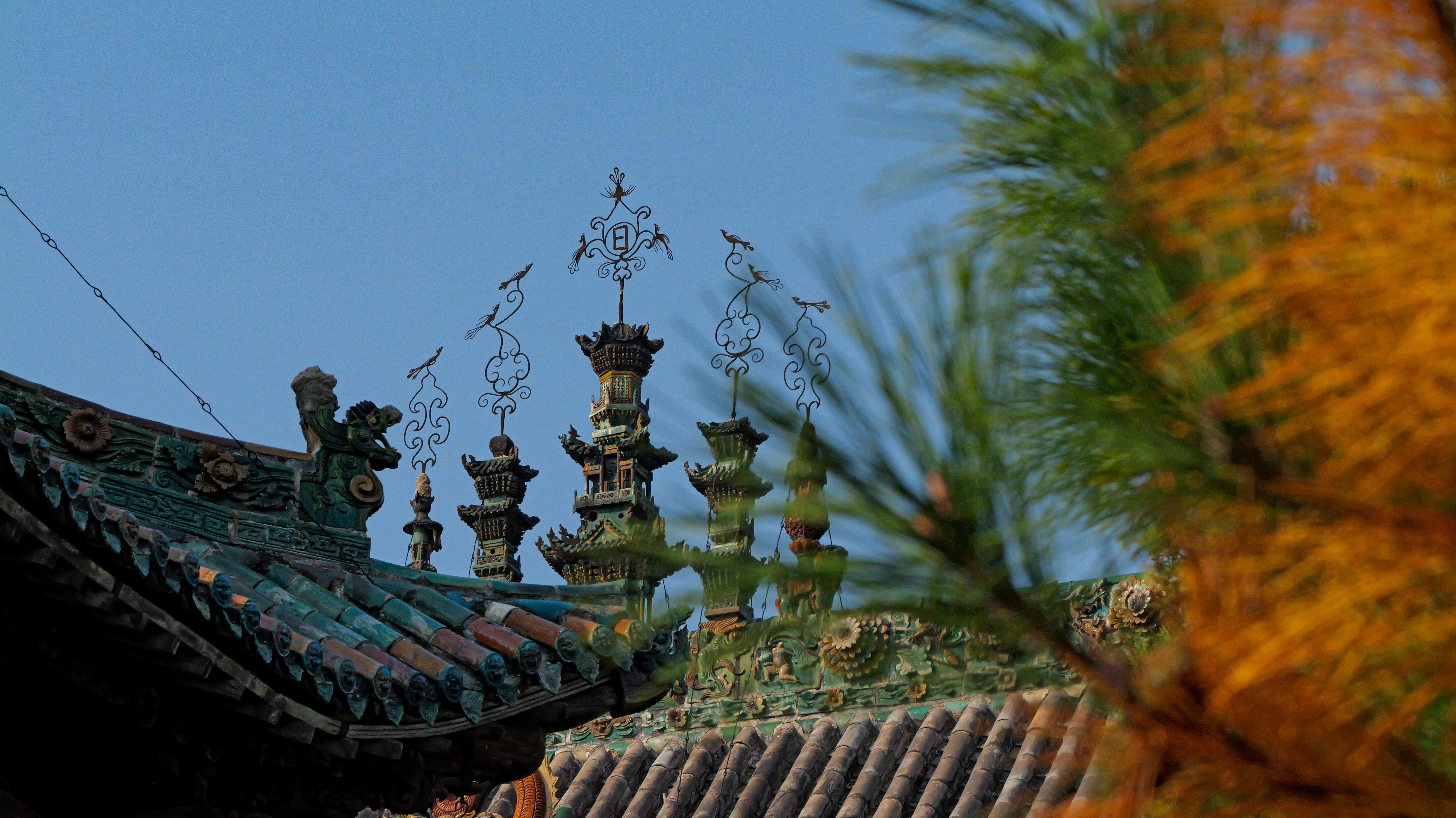 更让人惊叹的是琉璃的“活色生香”,不同角度的光线照射下,色彩会呈现出不同的层次。站在庭院东侧看,琉璃瓦泛着暖调的金光,像是镀了一层蜜糖;走到西侧,光线变暗,色彩又变得深沉厚重,红得更艳,蓝得更静,仿佛一幅流动的油画。据说这些琉璃都是当年的匠人手工烧制,从制坯、上釉到烧制,每一步都全凭经验,火候多一分则色焦,少一分则色浅,能留存至今且色彩依旧鲜亮,不得不说是古代工艺的奇迹。仰头盯着这些琉璃看久了,脖子酸痛是难免的,但视线移开的瞬间,满脑子都是那些流光溢彩的纹样,让人忍不住又回过头去,继续这场“颈椎挑战”。