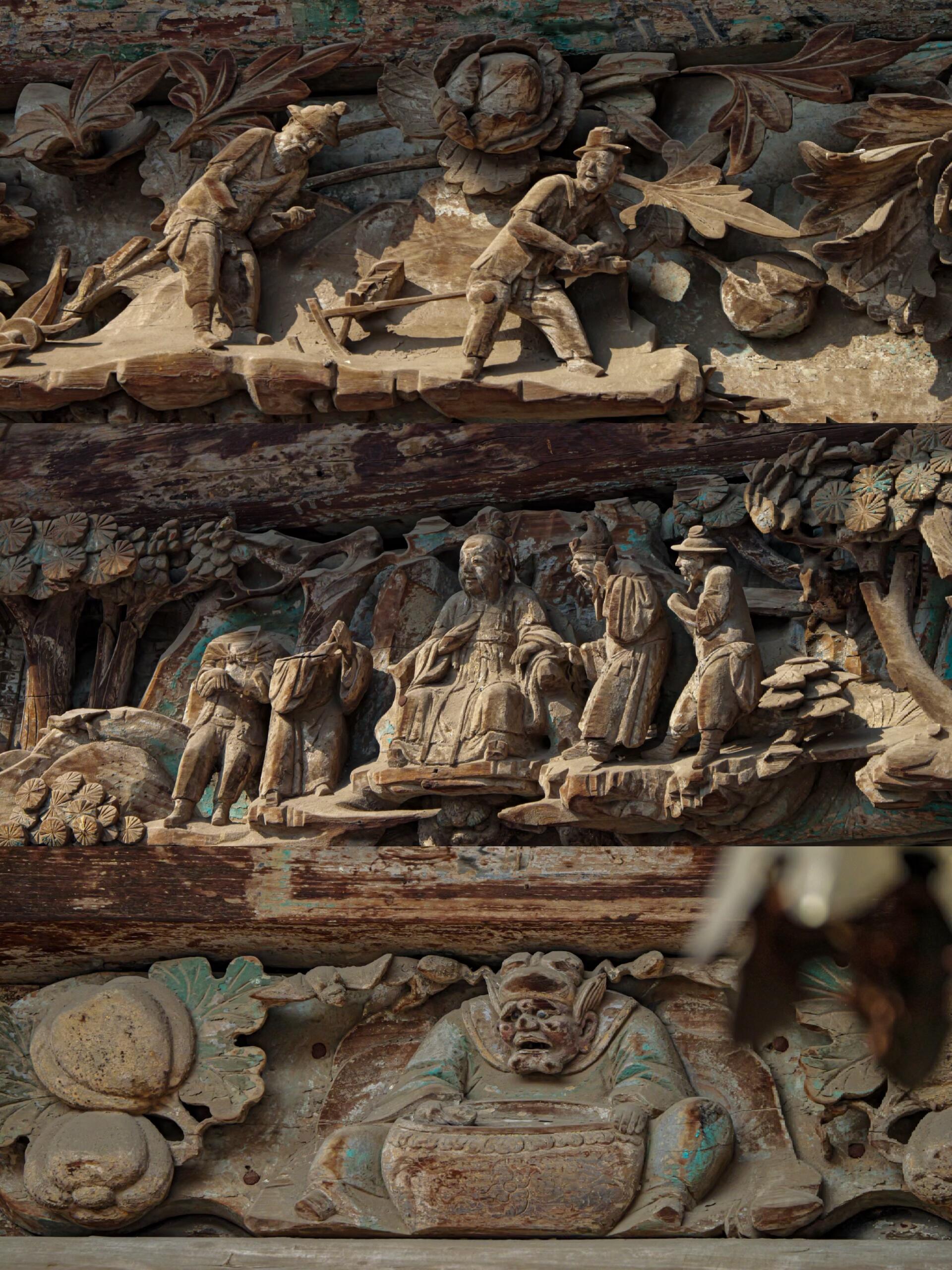 斗栱上的木雕更是“螺蛳壳里做道场”,小小的斗栱构件上,竟然雕刻着完整的“渔樵耕读”场景。渔夫坐在船头垂钓,鱼竿弯曲,仿佛钓上了千斤大鱼;樵夫背着柴薪,步履蹒跚,脸上满是疲惫却又带着满足;农夫牵着老牛耕地,牛蹄深陷泥土,尾巴轻轻摆动;书生坐在树下读书,眉头微蹙,神情专注。这些人物身高不过寸许,却五官清晰,神态各异,连衣服的褶皱、工具的细节都刻画得入木三分。不仔细看,根本发现不了这些藏在斗栱缝隙里的“小世界”,难怪有人说,逛稷王庙的木雕,得有侦探般的耐心和显微镜般的视力。