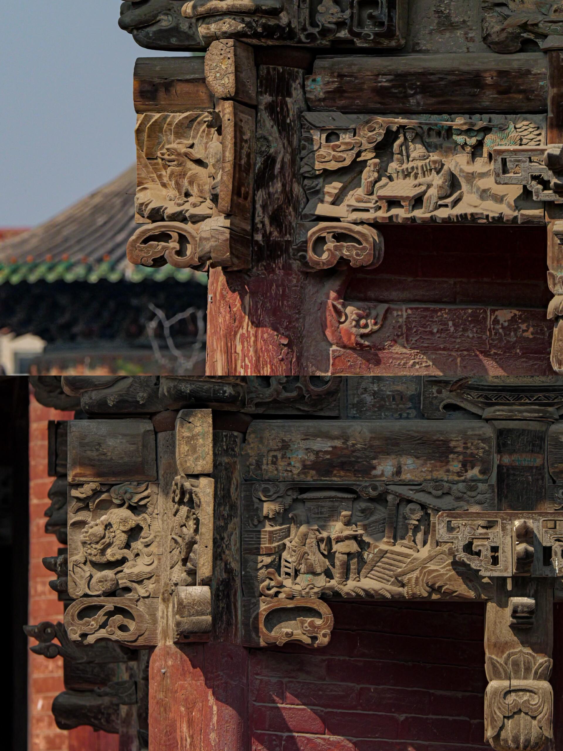 如果说琉璃是“远观惊艳”,那木雕就是“近赏沉迷”,不把眼睛凑到跟前,根本体会不到其中的精妙。稷王庙的木雕遍布梁枋、斗栱、门窗,几乎没有一处留白,大到数米长的梁架,小到指甲盖大的装饰,都雕刻得一丝不苟,堪称“寸木寸金”的艺术。同行的朋友带了望远镜,原本以为是多余,没想到在这里派上了大用场——举着望远镜看梁枋上的透雕,那些层层叠叠的花纹瞬间清晰起来,才发现看似一体的雕刻,竟然是由好几层组成,每层都有独立的图案,却又完美融合在一起,疏密有致,虚实相生。