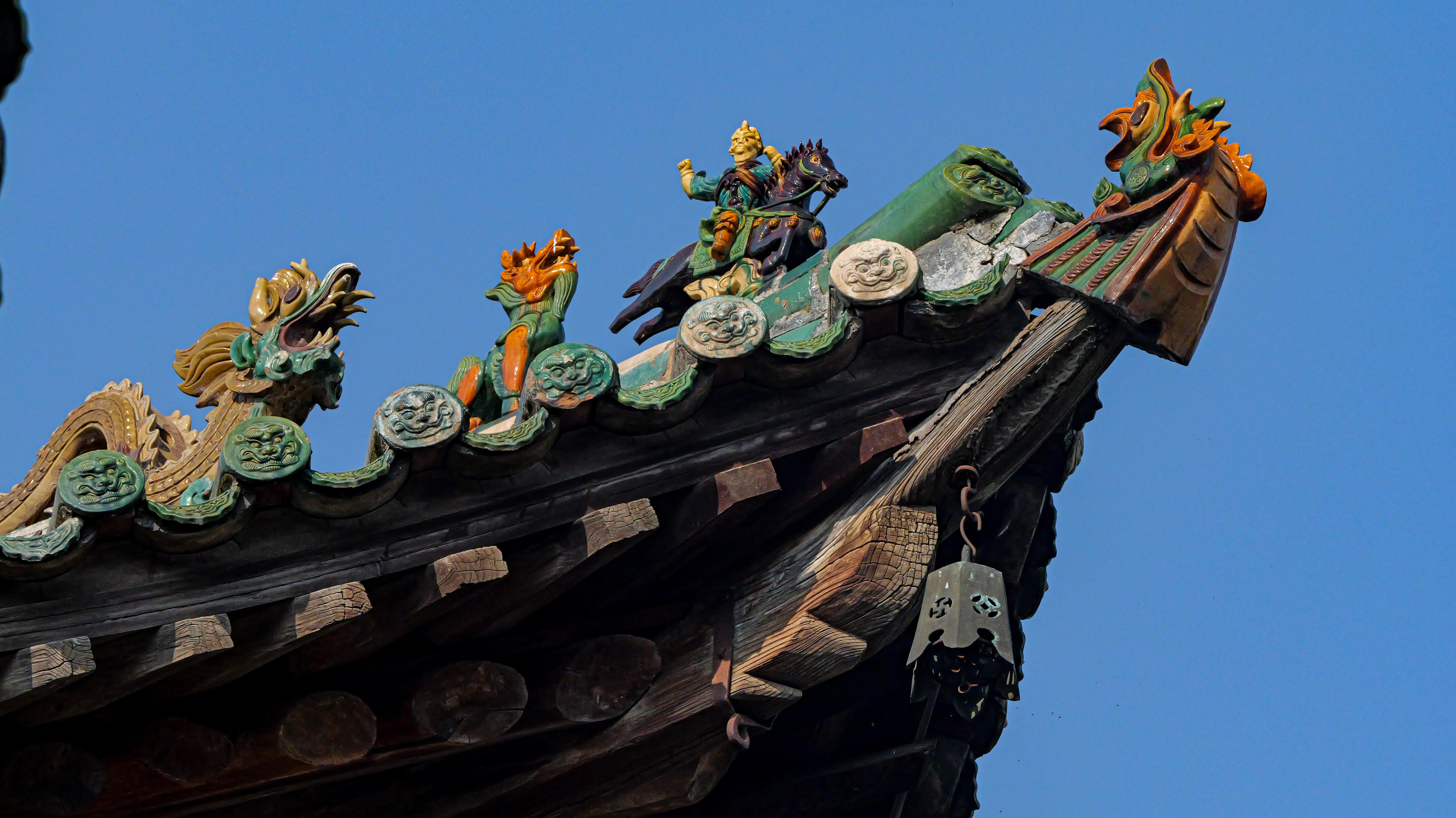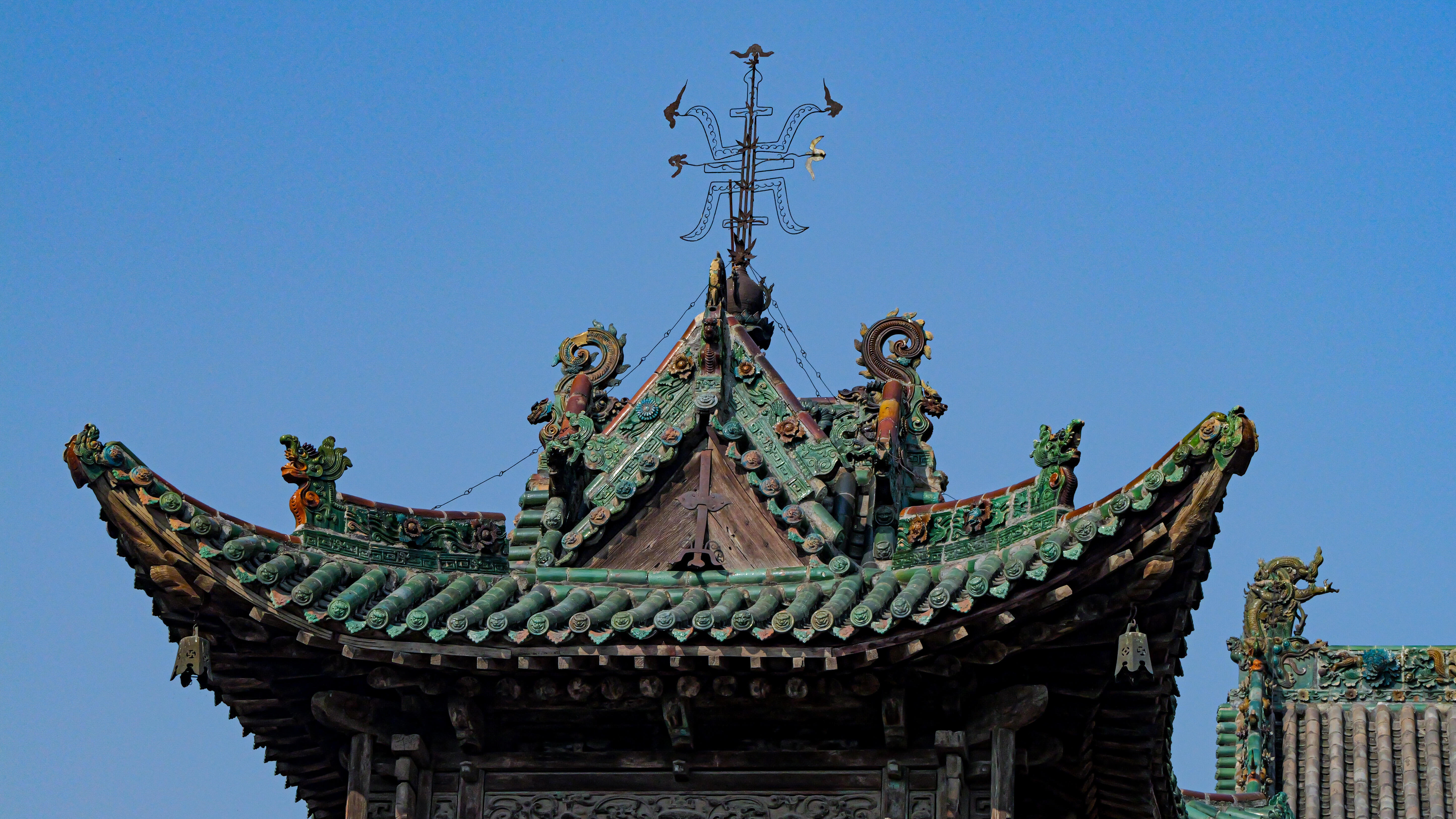 还没进山门,远远就被屋顶那片流光溢彩的琉璃给勾住了脚步。山西的琉璃甲天下,这话早有耳闻,但亲眼见到稷王庙的琉璃瓦,还是被那份浓艳却不艳俗、繁复却不杂乱的美狠狠冲击了。整座庙宇的屋顶几乎全被琉璃覆盖,正脊、垂脊、戗脊上,琉璃构件层层叠叠,色彩饱满得像是从颜料罐里直接捞出来的——正红如丹砂,明黄似蜜蜡,宝蓝像深海,翠绿若翡翠,还有那介于红紫之间的茄皮紫、介于黄绿之间的秋葵黄,数十种颜色交织在一起,却偏偏搭配得恰到好处,不见一丝凌乱。