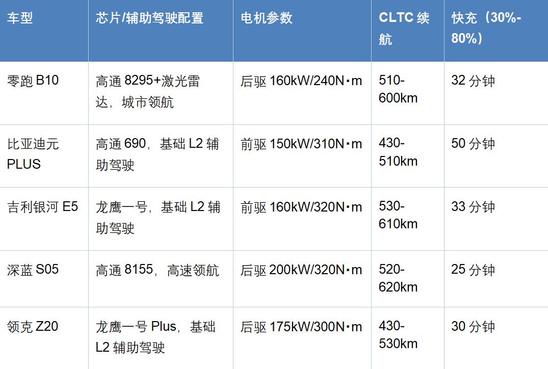 从芯片与辅助驾驶配置看,零跑B10搭载高通8295芯片+激光雷达,支持城市领航,辅助驾驶能力较为突出;深蓝S05配备高通8155芯片,具备高速领航功能,稍逊于零跑B10;其余车型仅提供基础L2辅助驾驶,其中领克Z20采用龙鹰一号Plus,在算力上略优于搭载高通690的比亚迪元PLUS和采用龙鹰一号的吉利银河E5。