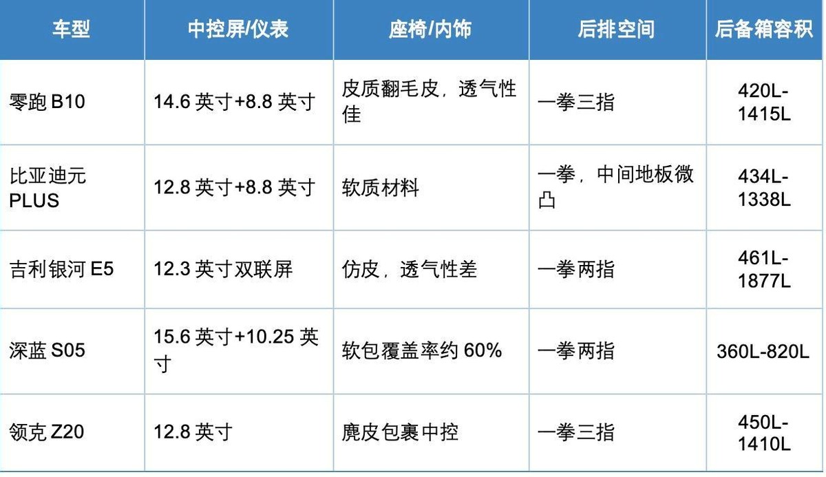 深蓝S05:15.6英寸悬浮屏+10.25英寸仪表。后排膝部空间一拳两指,后备箱常规容积360L,座椅放倒后扩展至820L。内饰软包覆盖率约60%,低于零跑B10。