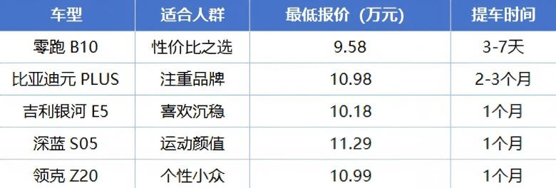 四、选购建议:按需匹配更理性通过对比,相信大家心里都有了自己的答案。萝卜青菜,各有所爱,如果注重品牌选比亚迪元PLUS;喜欢沉稳的选吉利银河E5;对运动颜值有追求的小年轻,选深蓝S05;个性小众的选领克Z20。但在我看来,这5款车型里面,零跑B10的诚意是满满的,10万元能买到价值20多万级别的配置品价比很高,而且零跑B10提车不用等,有的品牌要等一两个月甚至更久,刚需用车个人觉得还是越快越好。所以,你们知道怎么选了吗?