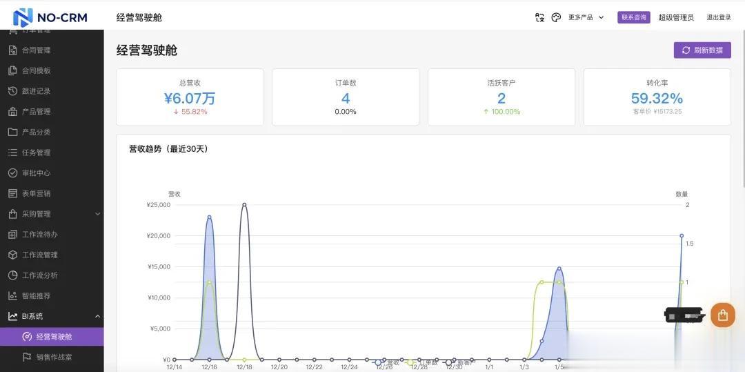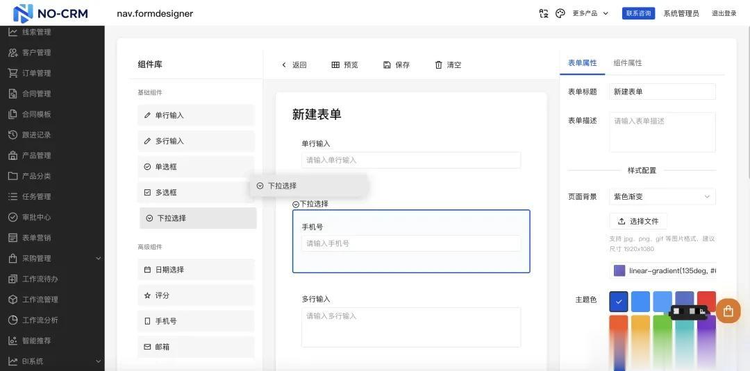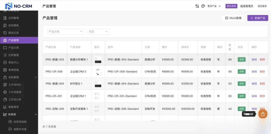 支持采购管理模块(采购全流程)供应商管理产品管理支持产品图片,产品规格,产品参数等字段订单管理支持分组支持BI模块(销售驾驶舱和销售大屏)优化RBCA权限系统合同管理支持附件上传功能可视化工作流审批可视化表单引擎(表单设计器)最近创业也接触了很多中小企业和独立开发者,对中小团队在客户管理上的痛点也有了更深的认知,比如:预算有限、需求复杂、开发周期长。正是这些痛点,促使我做了 NO-CRM 项目。