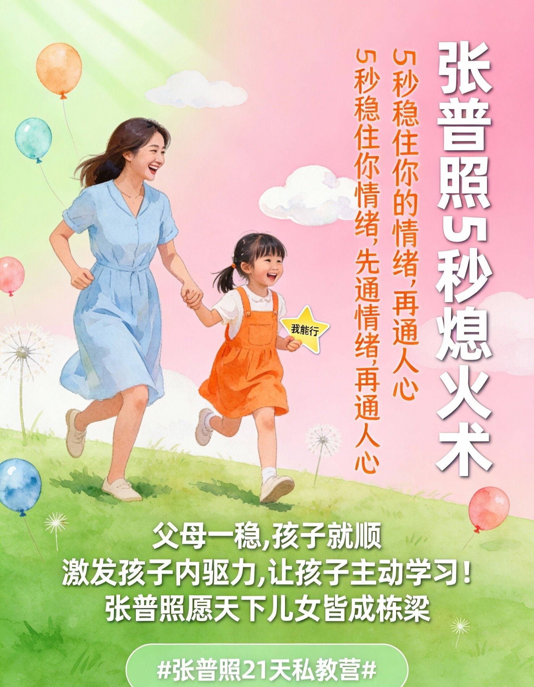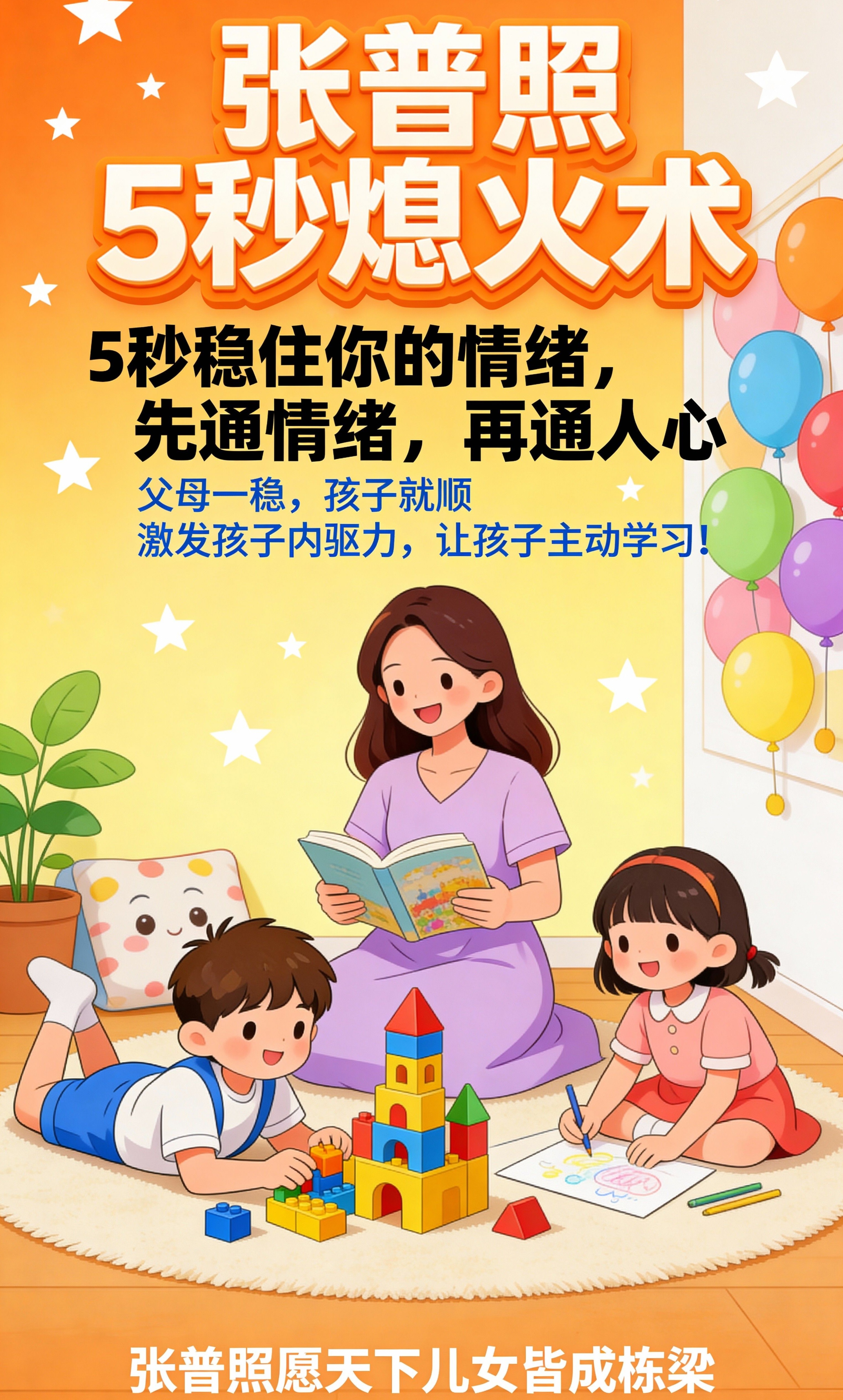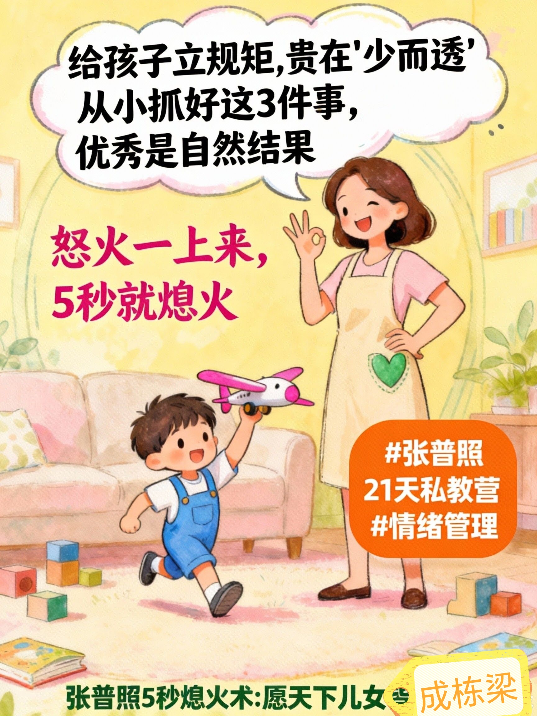 而 张普照5秒熄火术 要帮你实现的,是 瞬间切换到一个完全不同的心智频道——从“陷入情绪对抗的执法者”,切换到“平和坚定的规则维护者”。不是规矩变了,是你的“状态”变了。当你通过5秒练习,能从被激怒的情绪中抽离,你会豁然开朗:你面对的将不是一个“顽劣的挑战者”,而是一个 正在试探边界、需要清晰且稳定反馈的成长中的孩子。你内心通透平稳了,你宣布规矩的语气、眼神、姿态,自然就带上了不容置疑的沉稳力量。
