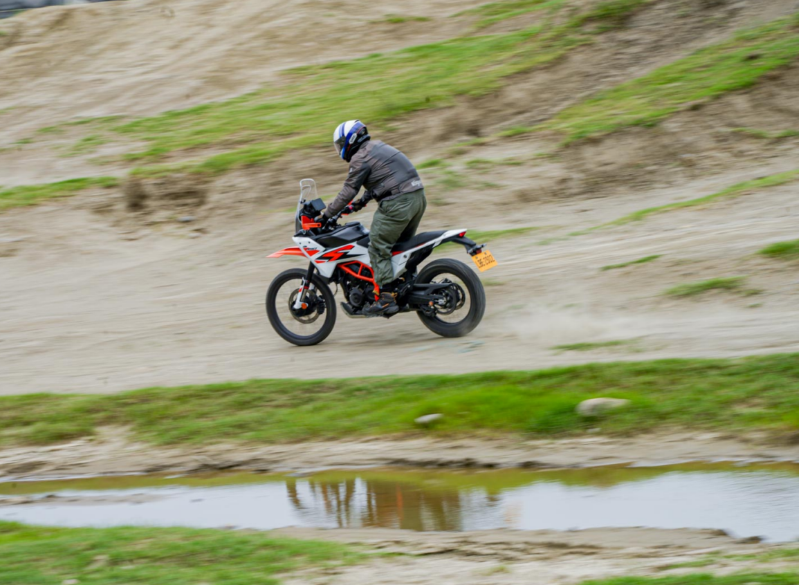 换到 390 SMC R 身上,虽然水牛坑的土质环境对滑胎车来说相当吃力,但通过周边的一小段柏油路与平坦碎石路感受,依然能体会到它极致的灵活感; SMC R 的起步动力感受比上一代更加饱满,在短距离加速时的推力相当有感。