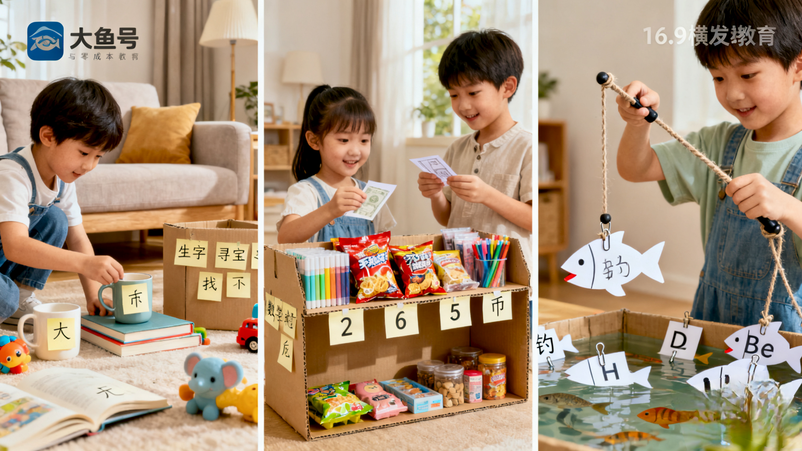 4. 拼音钓鱼游戏(零成本道具:硬纸板+磁铁+筷子)