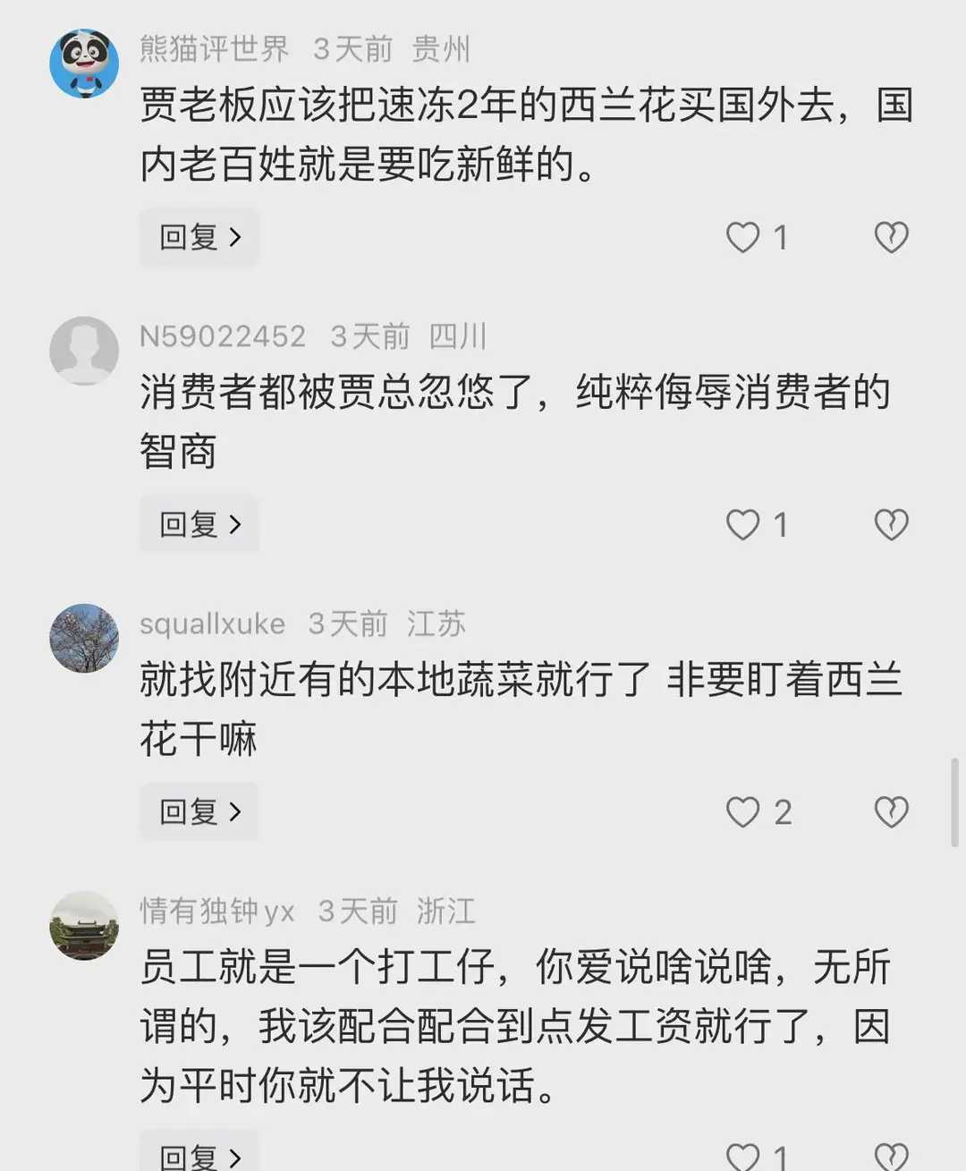 有人进行调侃,这或许是身为一把手的时间实在是太长了,久到在公司之中已经养成了说一不二的习惯,以至于错误地认为到了网络之上,面对着数量极为庞大可达千千万万的网友,同样能够达成“一呼百应”的效果。结果呢,这番涉及“冰冻西兰花才新鲜”题材的言论,自然而然地又沦为了众人的笑谈。网友们表达得更为直白:“经过冷冻两年之久的菜,难道还能够比刚刚采摘下来的更为新鲜吗?这样的逻辑实在是令人感到费解。”“贾总身旁难道就没有一个头脑清醒明白事理的人去对他进行规劝吗?真的是让人发愁得不行。”