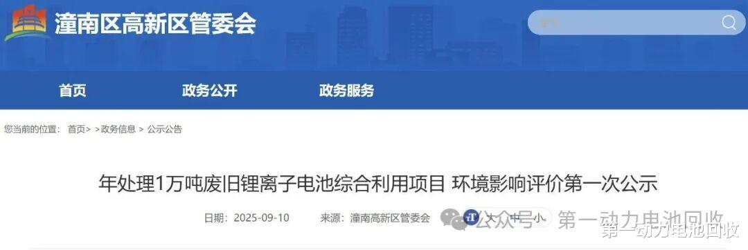 第一动力电池回收消息,近日,重庆市潼南区管委会正式发布了《重庆弘喜锂想能源有限公司年处理1万吨废旧锂离子电池综合利用项目》的环境影响评价第一次公示。该项目选址于潼南区梓潼街道创业大道13号,规划建设包括废旧锂离子电池储存场地、拆解线、梯次利用产品装配线、检测线及产品储存场地等设施,预计年产梯次利用锂离子电池产品达200MWh,标志着重庆在动力锂电池循环利用领域迈出重要一步。