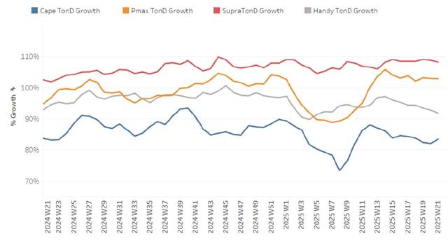 ·灵便型散货船:自第13周末达到峰值以来,增长率有所放缓,表明本月下半月将进一步呈现下降趋势。