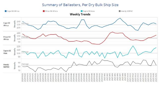 根据Ballaster指标,南非东南部的好望角型散货船和巴拿马型散货船活动仍高于年度平均水平。