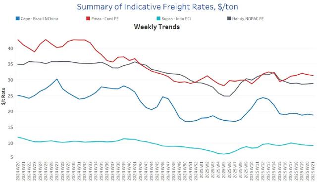 ·在东南亚,超灵便型散货船干散货市场呈现出强劲上升趋势,超过了第13周之前的峰值。