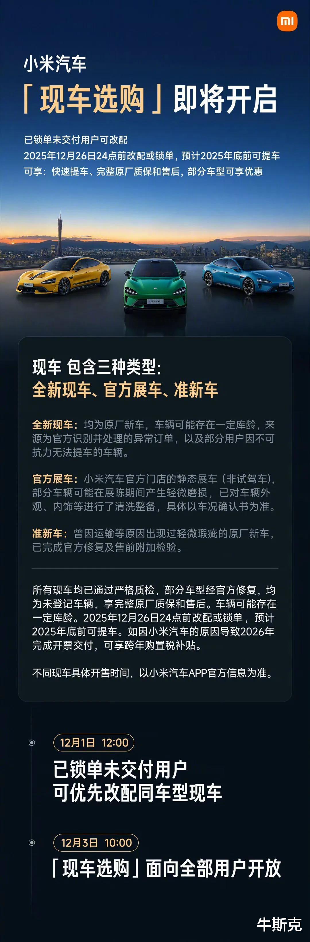 当然除了11月份交付上量以外,小米汽车在近期也是持续出招。就在今天,小米汽车方面发布了一个新的政策,就是用小米汽车用户,可以通过改配的方式尽快提车。该政策的现车包含全新现车、官方展车以及准新车三种类型,并且小米承诺全部车辆都已经通过严格质检,可以享受完整原厂质保和售后,部分车型还可以享受优惠。