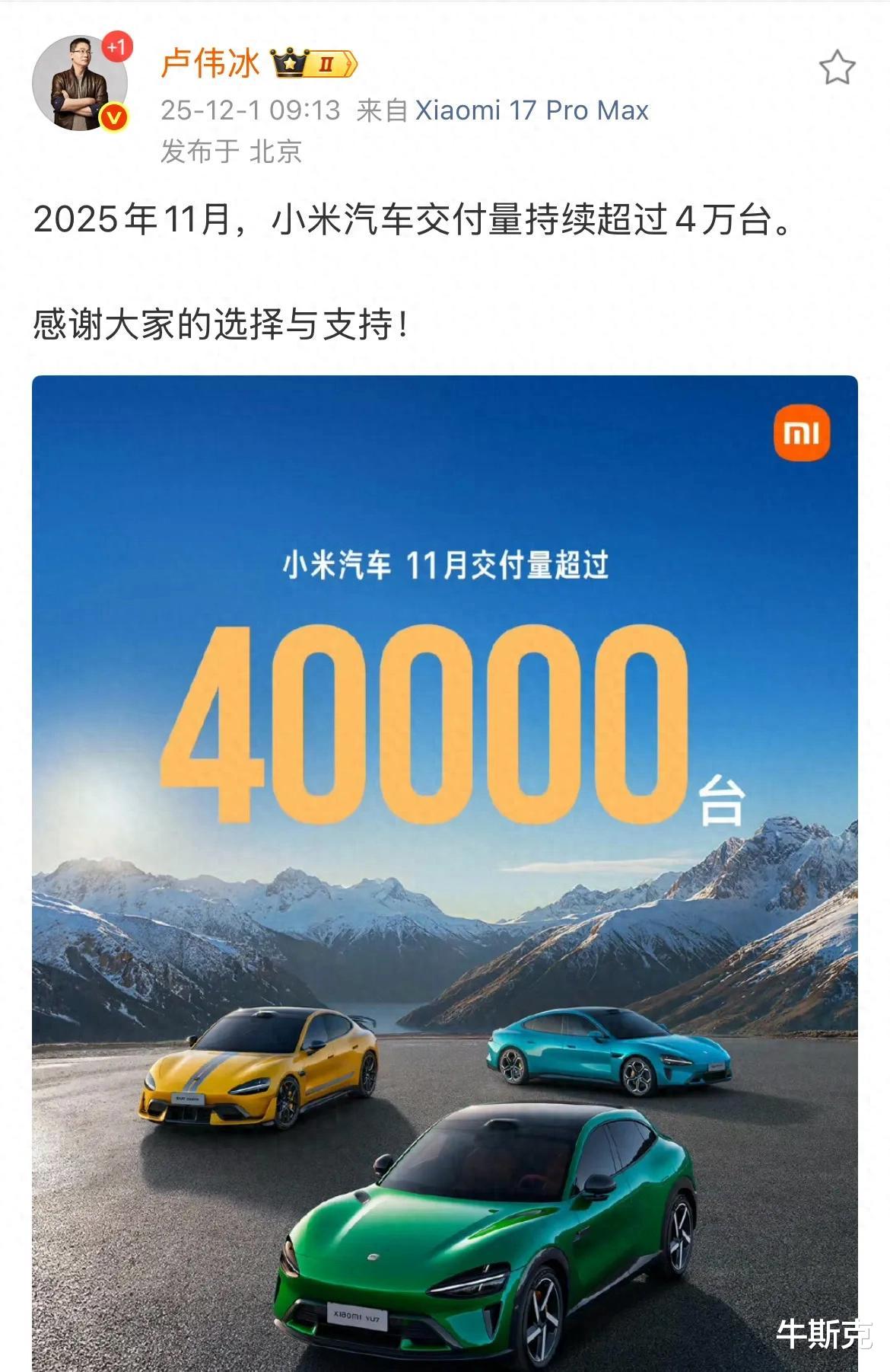这样的情况,对于其他车企来说,可是相当不容易的。但对于小米,似乎成为了理所当然的绝对事件。要知道现在小米汽车主打的就是两款车,小米SU7和小米YU7,试问哪一家车企能单靠两台月交付量持续上4W?这个答案不言而喻了吧。所以作为小米手机部总裁,卢伟冰率先发布了这个喜讯。