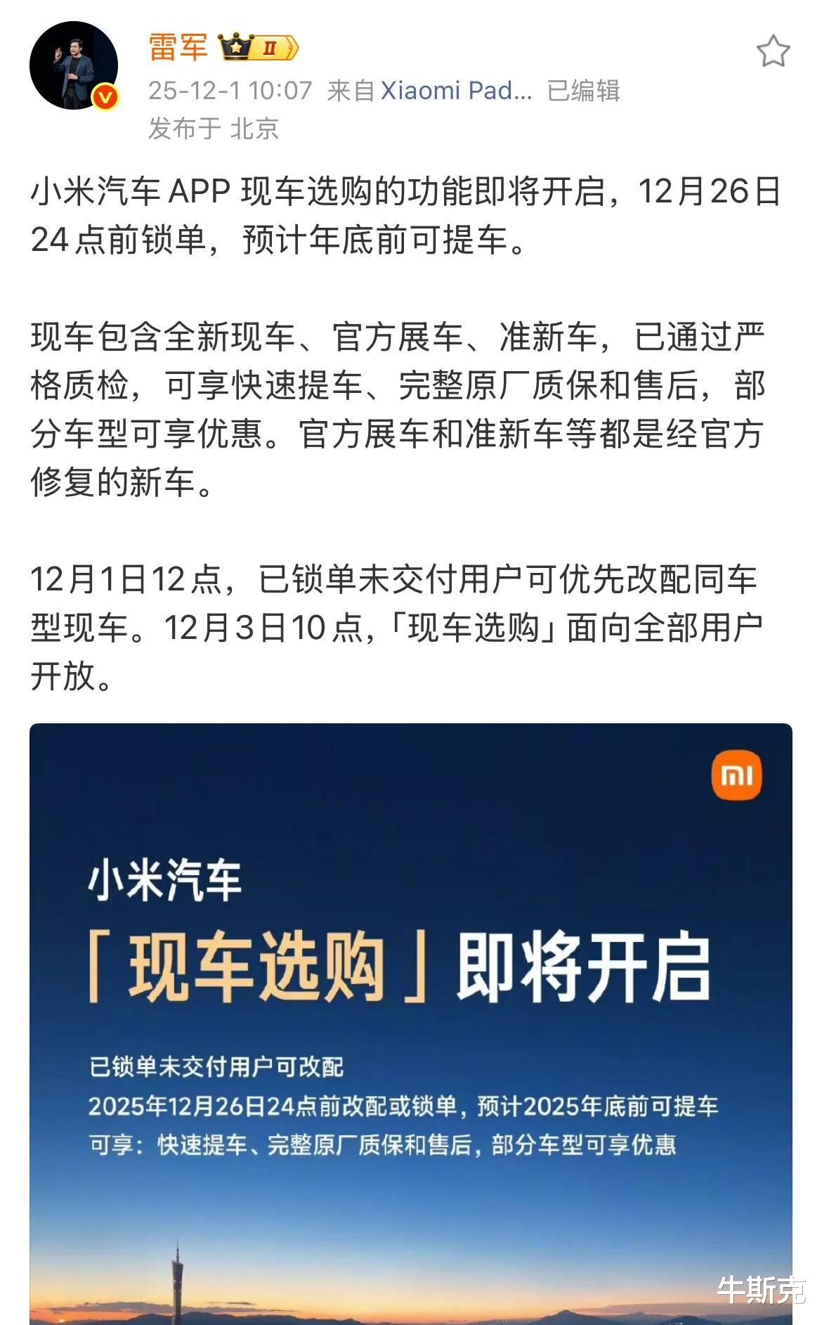 雷总也明确说了,到12月3日的上午10点,现车选购面向全部用户开放。所以小米汽车的交付问题即将成为过去,未来的现车购买将成为一种趋势。当然这也是小米智造升级带来的福利,小米一直在加大科技创新投入,将不可能变成可能。
