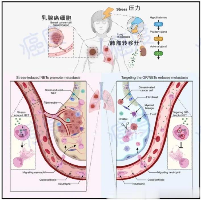 Cancer Cell发表的一项研究显示:慢性压力会影响糖皮质激素水平,进而导致中性粒细胞形成粘性网状结构,这个网状结构就是有利于癌细胞转移的环境。