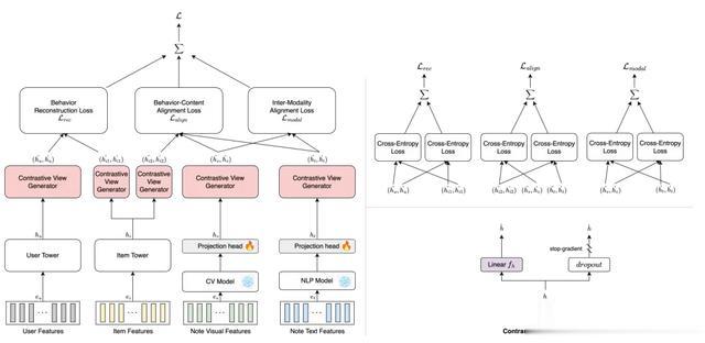 图(a),直接利用,比如把 embedding,多模态特征作为信号输入网络;图(b),利用图等方式聚合,希望能得到更丰富的多模态信息表达,这本质上也是增加多模态侧信息的召回率;图(c),联合优化,把模态损失和行为损失共同优化,但这忽略了本身笔记侧的多模态学习。在工业界,现阶段推荐系统主要还是依赖于 ID 特征的学习, 大多数多模态推荐把多模态信息作为 sideinfo 去辅助 ID 特征的学习。但是, 多模态之间以及 ID 模型与多模态之间都存在着语义鸿沟, 直接使用甚至可能适得其反。