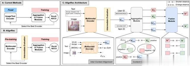 我们所提出的方法命名为 AlignRec,整体框架如下图所示, 主要包含3个模块: Multimodal Encoder Module, Aggregation Module, 以及 Fusion Module, 下面分别进行介绍。