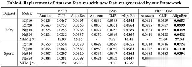 在开源数据集上生产的多模态特征与开源多模态特征对比效果上,AlignRec 的性能明显提升: