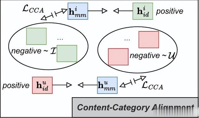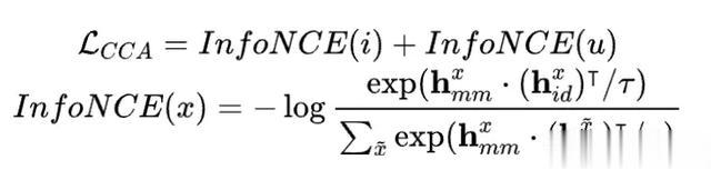 User 侧和 Item 侧的 ID 模态,通过图聚合的方式,得到 User 和 Item 的表征,分别表示为 和 ;物品侧的多模态表征,内容模态表征经过一个 MLP 进行映射,再做 Element-wise 乘积与 ID Embed 进行融合, 得到融合了内容先验知识的内容表征,之后基于统一的内容模态表征, 构造物品侧的相似矩阵,每个物品取与它最相似的 10 个 Item 做聚合, 得到物品侧的多模态表征输出,表示为 ;用户侧的多模态表征,对于 User 侧,通过聚合用户历史交互过的 Item 得到用户侧的多模态表征,表示为 ;训练细节上,我们使用 InfoNCE 对齐内容模态表征和 ID 模态表征,让同 Item 的内容模态表征与 ID 模态表征更接近,不同 Item 的内容模态表征及 ID 模态表征的距离更疏远。但如果不加任何约束, 可能会盲目地趋近于表征 ,引起模态表征坍塌。为了规避这个问题,我们增加了正则项约束: