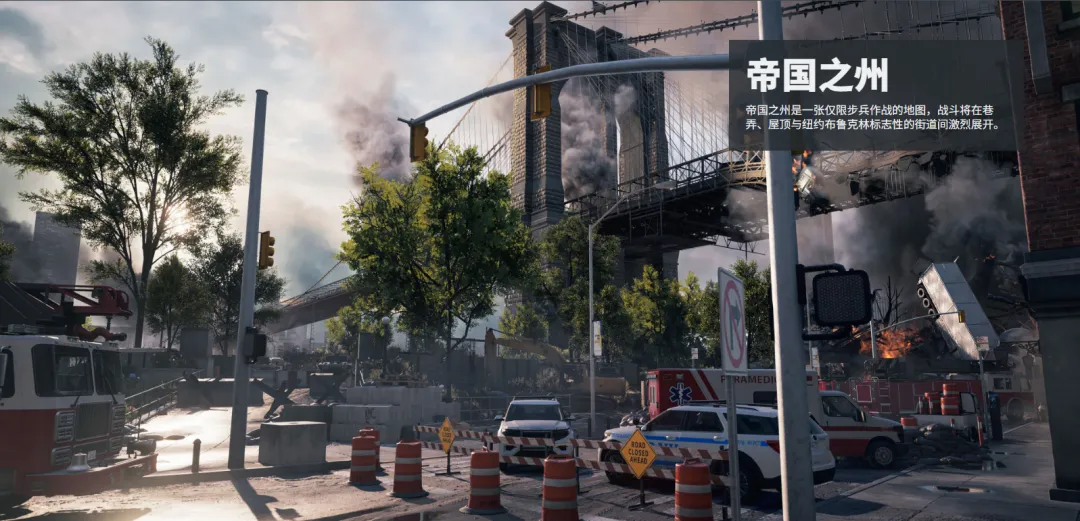 而这一代的步战地图规模普遍偏小,交战节奏非常快,更注重巷战、室内近距离战斗和垂直层面的交锋。例如帝国之州这张街区地图,室内往往是上下3层的贯通设计,其中心大楼的回廊区域四面透风,加之玩家普遍较短的TTK,交战密度大幅上涨。