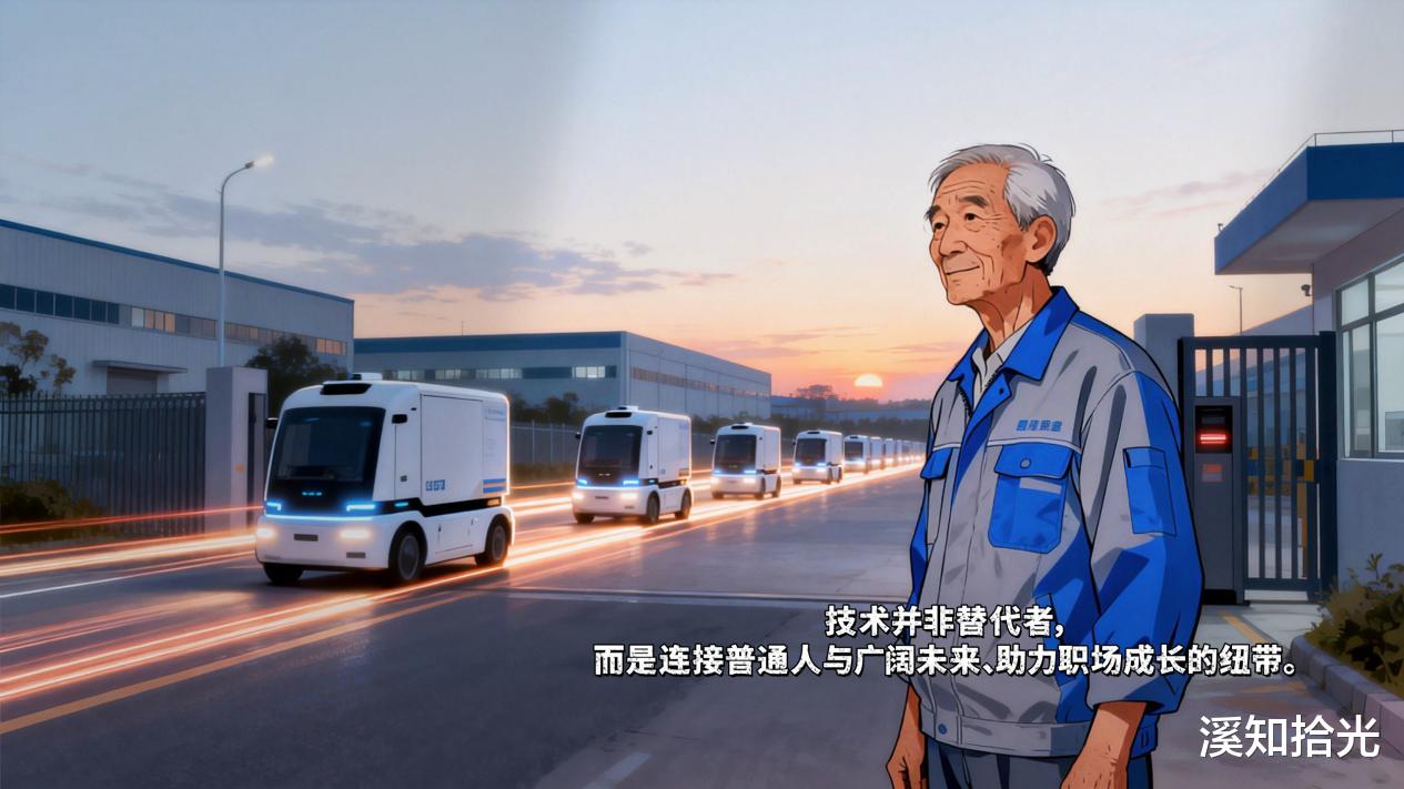 他站在园区门口,看着无人配送车一排排地朝着城市各个角落开去,车灯在暮色里划出一道道流动的光轨,