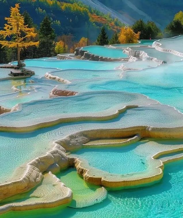 黄龙五彩池周围的山峦环绕,云雾缭绕,给人一种神秘而宁静的感觉。湖水倒映着蓝天白云和群山的轮廓,仿佛置身于仙境之中。湖畔的花草树木也是五彩斑斓的,与湖水相映成趣,构成了一幅美丽的画卷。