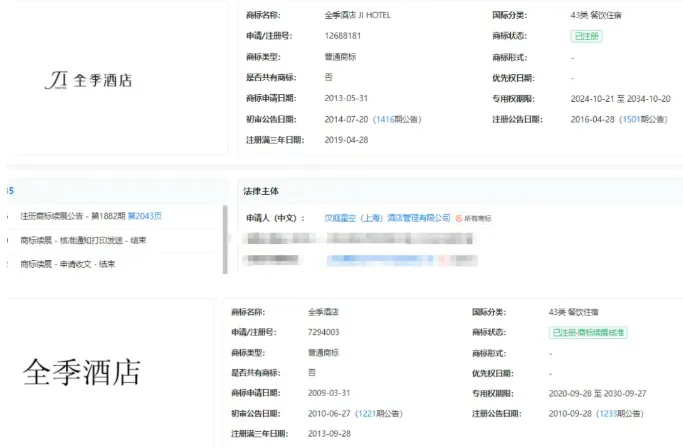 汉庭星空(上海)酒店管理有限公司,作为国内知名的多品牌连锁酒店管理集团,拥有诸如美爵、花间堂、全季、桔子水晶、汉庭在内的众多知名酒店品牌,其注册拥有的第7294003号“全季酒店”商标,第12688181号“全季酒店及图形”商标,经过长期的使用推广,赢得了广大消费者的喜爱,具有较高的市场知名度。