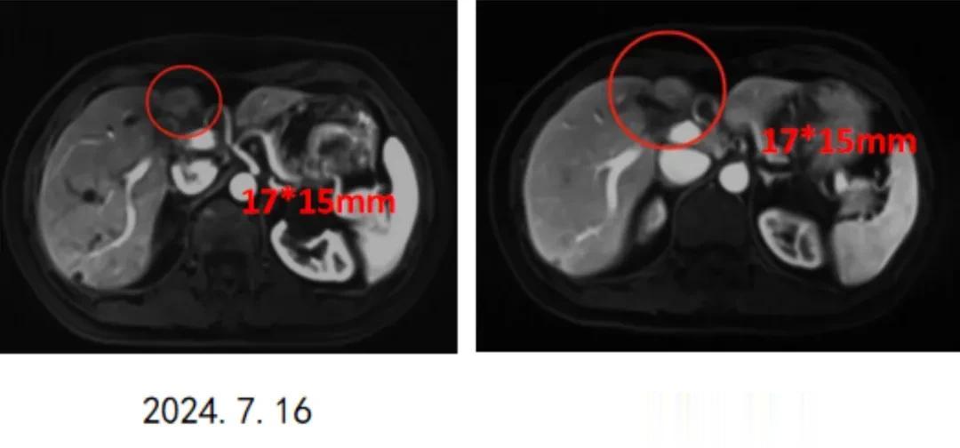 但化疗结束3个月后,2024年7月的复查就出现了异常,肝左外叶环形强化灶,长径约11mm,转移不除外。