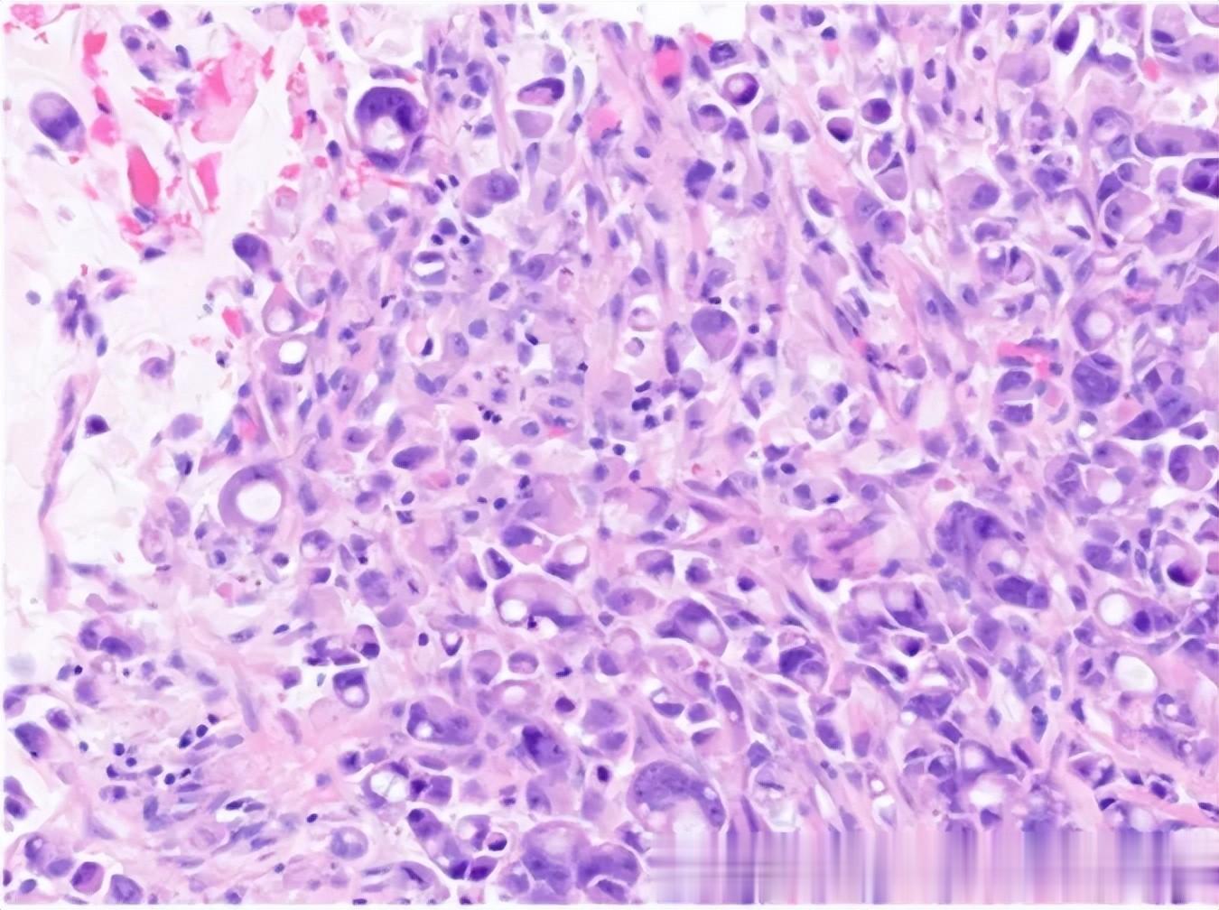 *术后病理回报:胆管壁组织可见纤维组织增生及慢性炎症、多核巨细胞反应,局灶神经束可见异型细胞浸润,符合低粘附性癌细胞侵犯神经;胆管壁外可见淋巴结,未见癌转移。