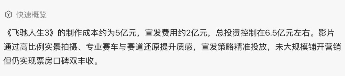 《飞驰人生3》总成本高达6.5亿人民币,放在整个春节档历史上都属于第一梯队的投资规模,其中纯制作成本接近4.5亿,赛道实拍、赛车改装、特效镜头、实景搭建等环节全部按顶级标准执行。