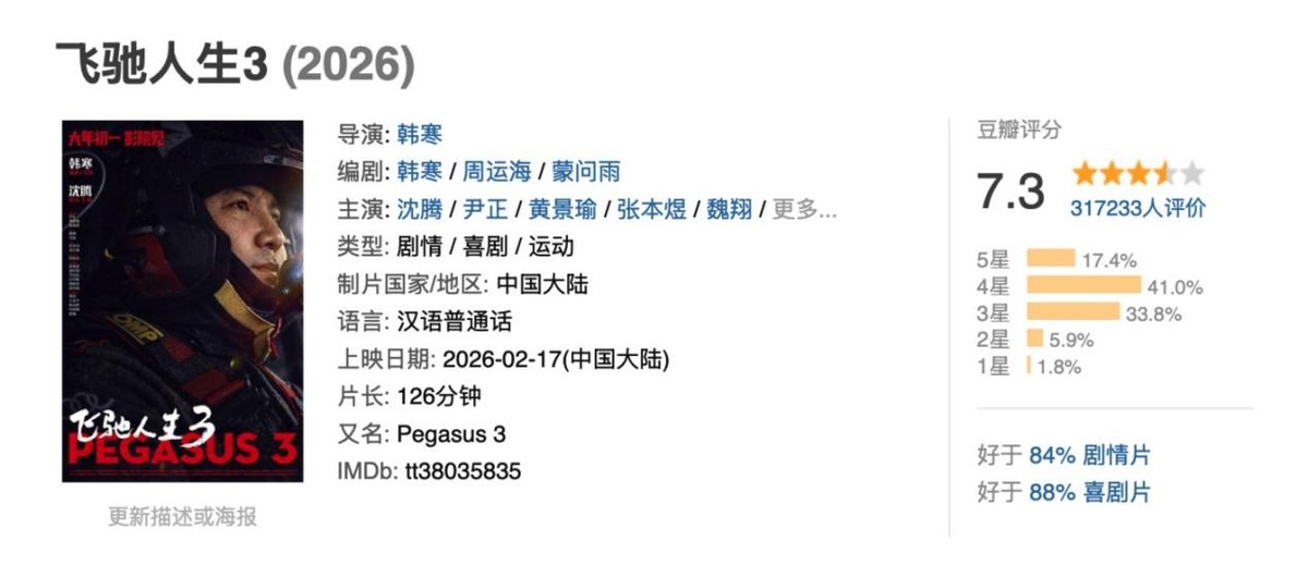 这种近乎碾压式的国民认可度,让《飞驰人生3》从根本上就赢在了起跑线上。