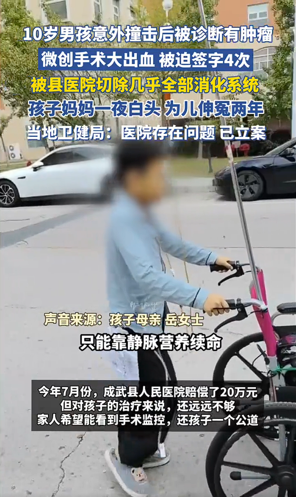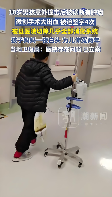 2023年10月26日,山东菏泽成武县10岁男孩小烨在课间被同学撞到腹部后持续腹痛,母亲岳女士带其前往县人民医院就诊。医院通过加强CT发现“胃与胰腺间占位性病变”,随即建议腹腔镜探查术。手术开始仅10分钟,医生以“肿瘤破裂出血”为由要求转为开腹手术。此后14小时内,主刀医生四次要求家属签署知情同意书,先后切除其十二指肠、胰腺、胆囊、2/3胃部及大部分小肠,仅保留不足50厘米结肠。术后,小烨被迫终身依赖每日3000毫升静脉营养液维持生命,无法自主进食饮水。