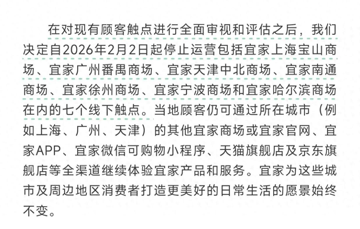 2026年1月7日,宜家中国一纸公告引发全网热议:自2月2日起,将停止运营上海宝山、广州番禺、天津中北、南通、徐州、宁波、哈尔滨七家线下商场,这是其入华26年来最大规模的单次关店动作。这场突如其来的布局调整,让这个承载了无数人生活记忆的家居巨头,再次站到了舆论聚光灯下。